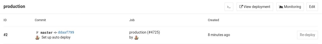 If you have a deployment service such as Kubernetes enabled for your project, you can use it to assist with your deployments, and can even access a web terminal for your environment from within GitLab!